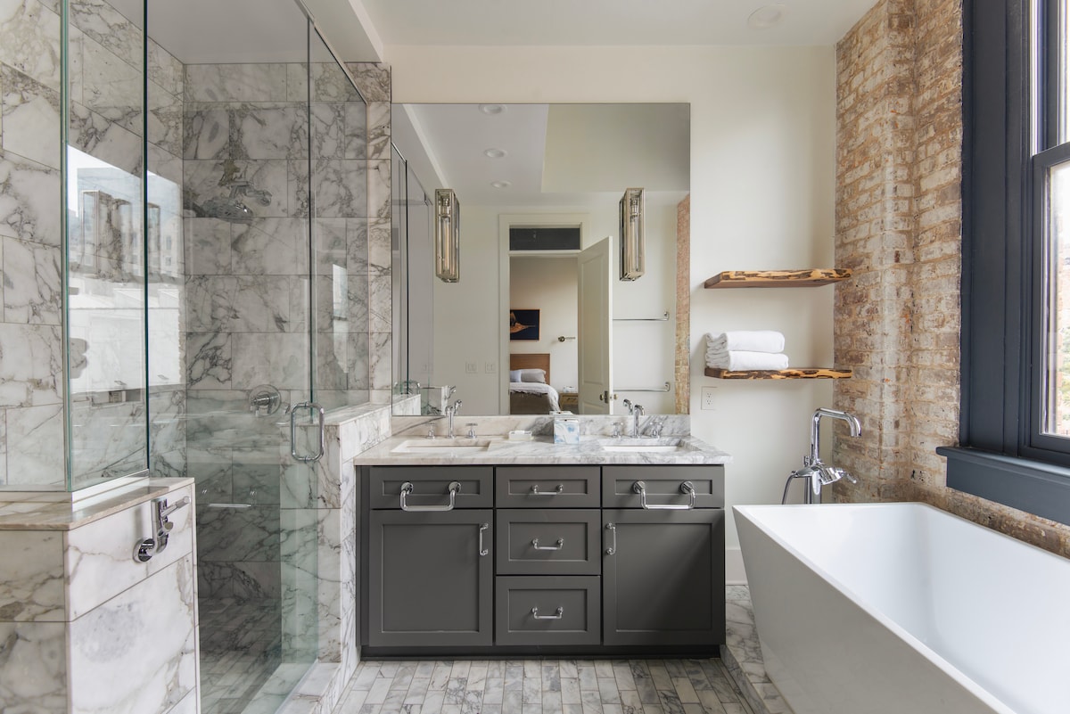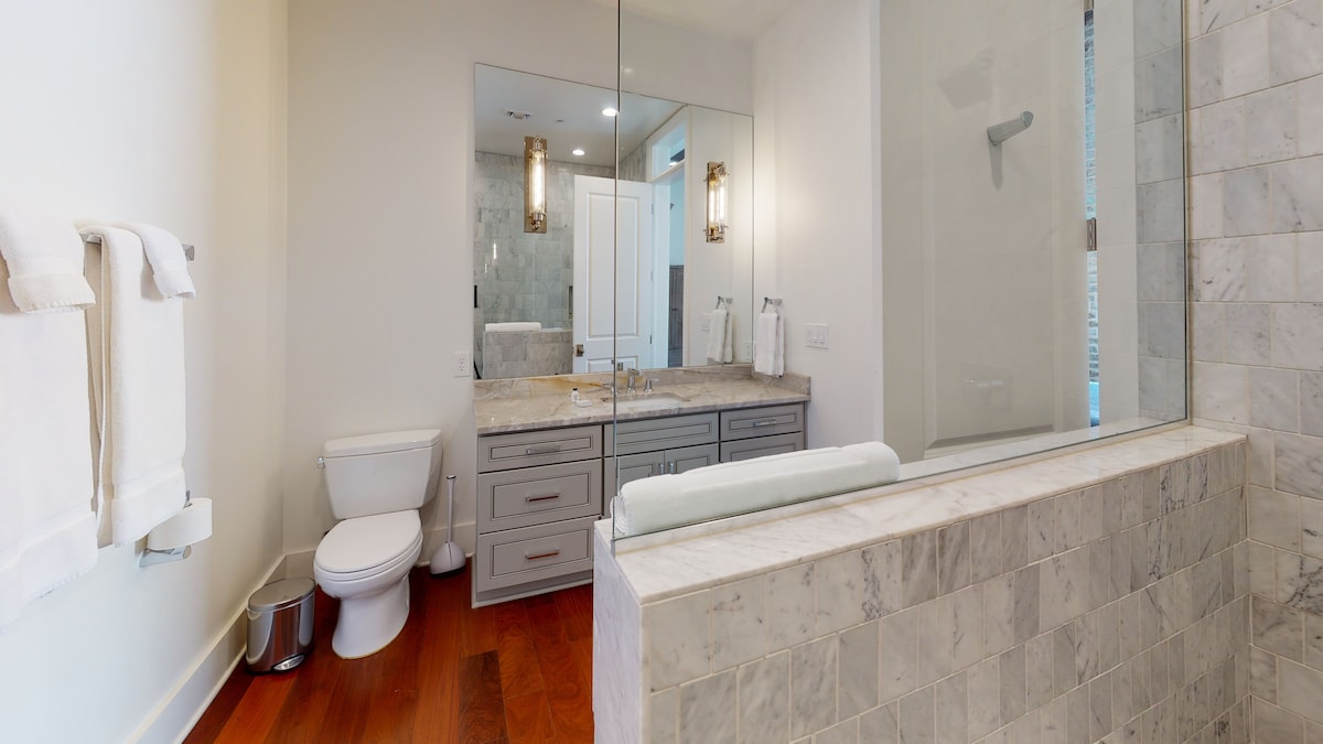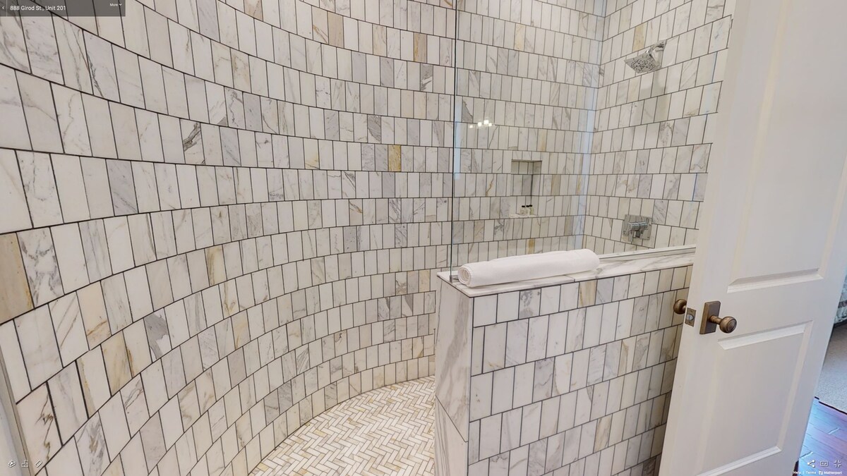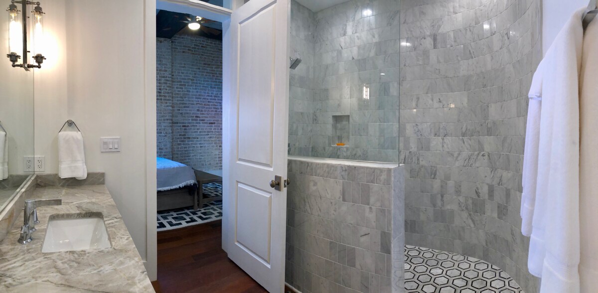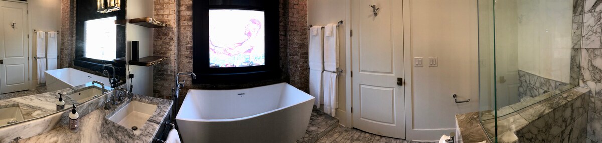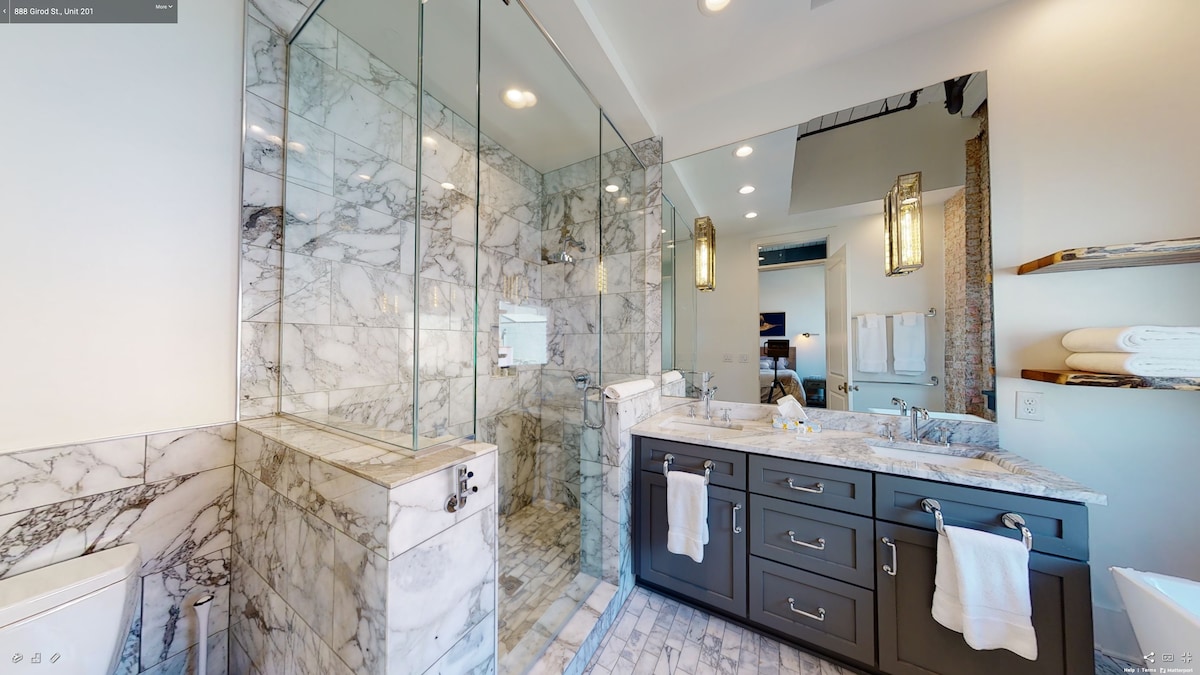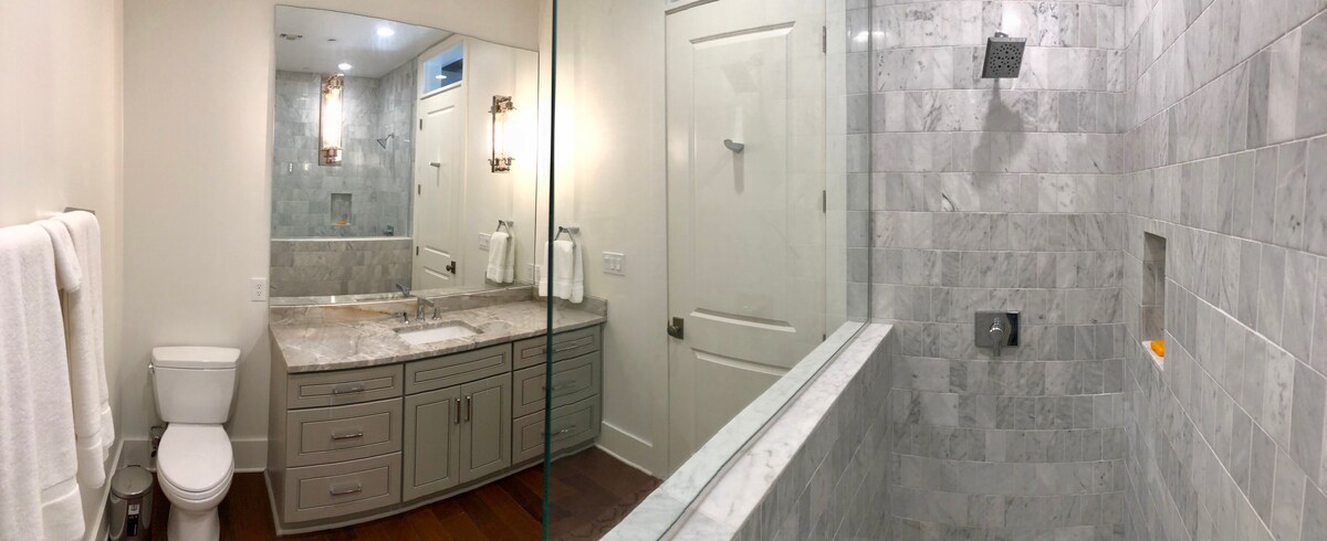 Bathrooms have hand selected marble countertops, marble tile walk in showers, and the master bathroom has both a walk in shower and a modern soaking tub.
