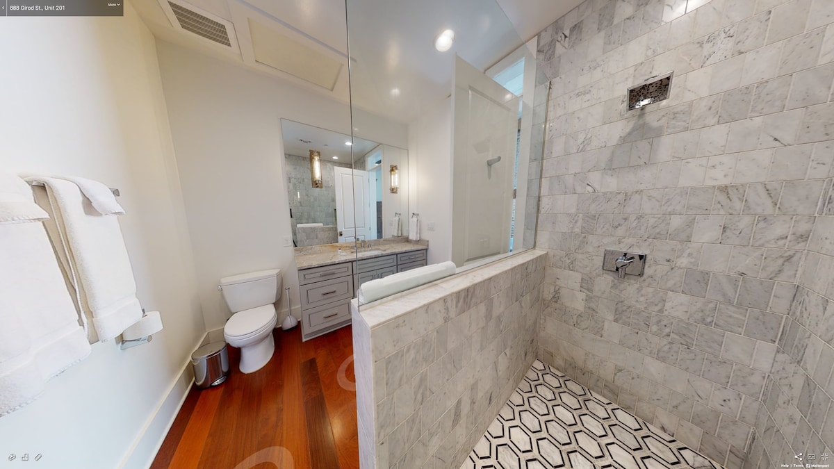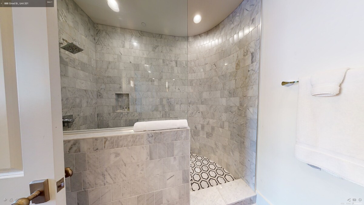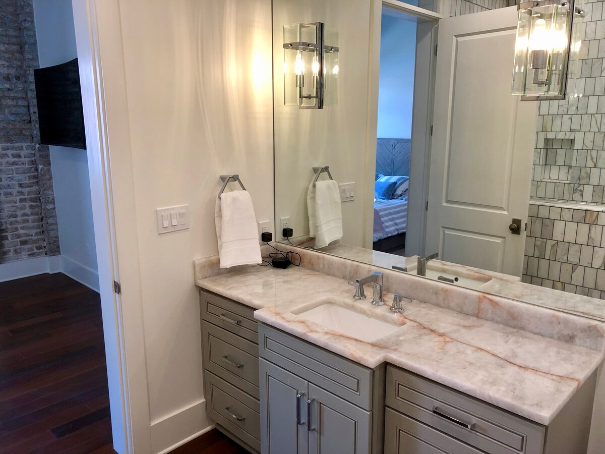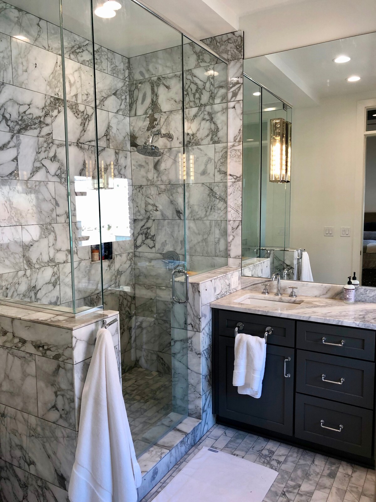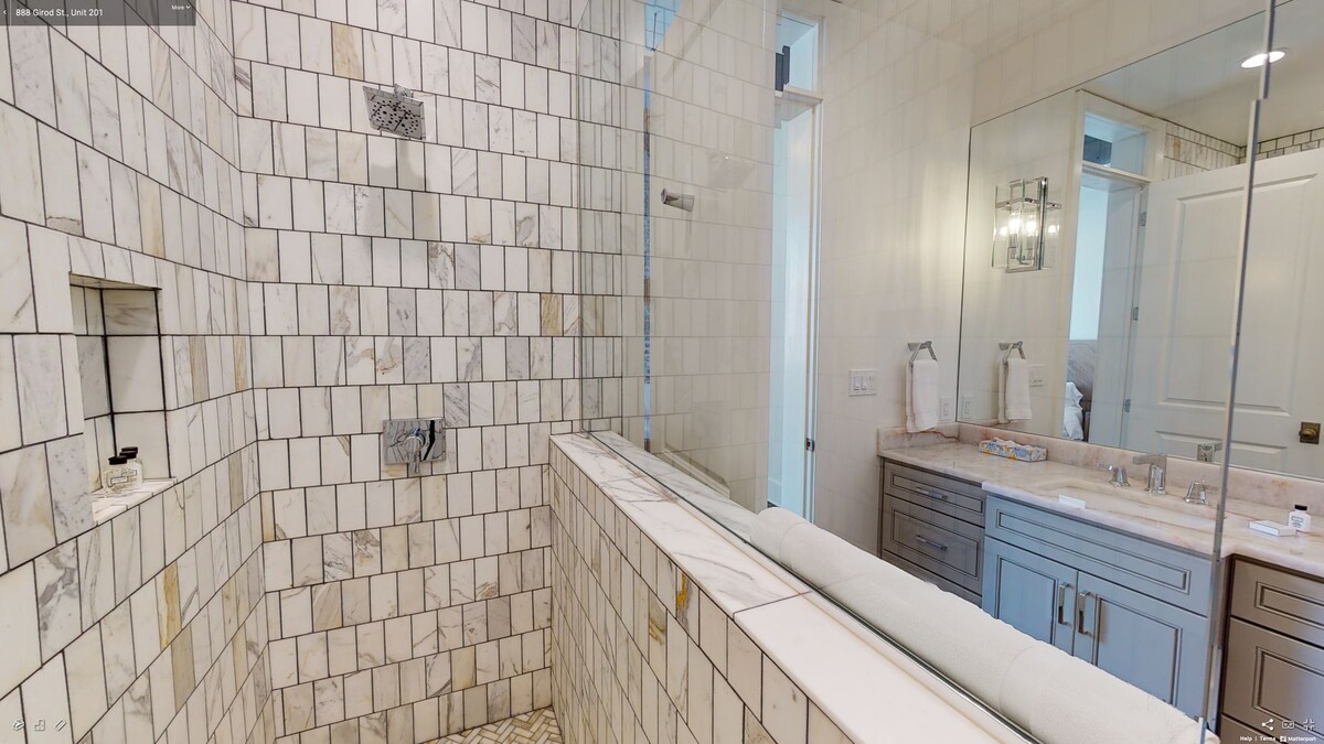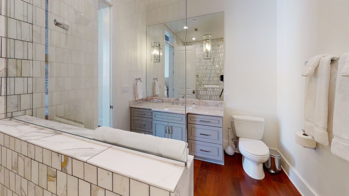 Bathrooms have hand selected marble countertops, marble tile walk in showers, and the master bathroom has both a walk in shower and a modern soaking tub.
