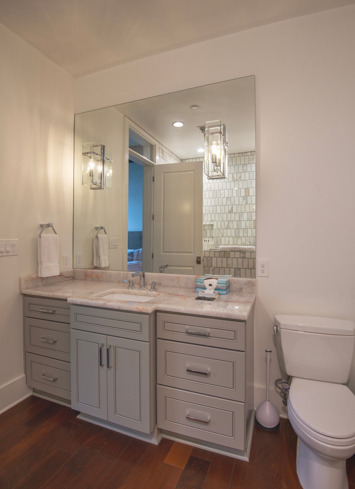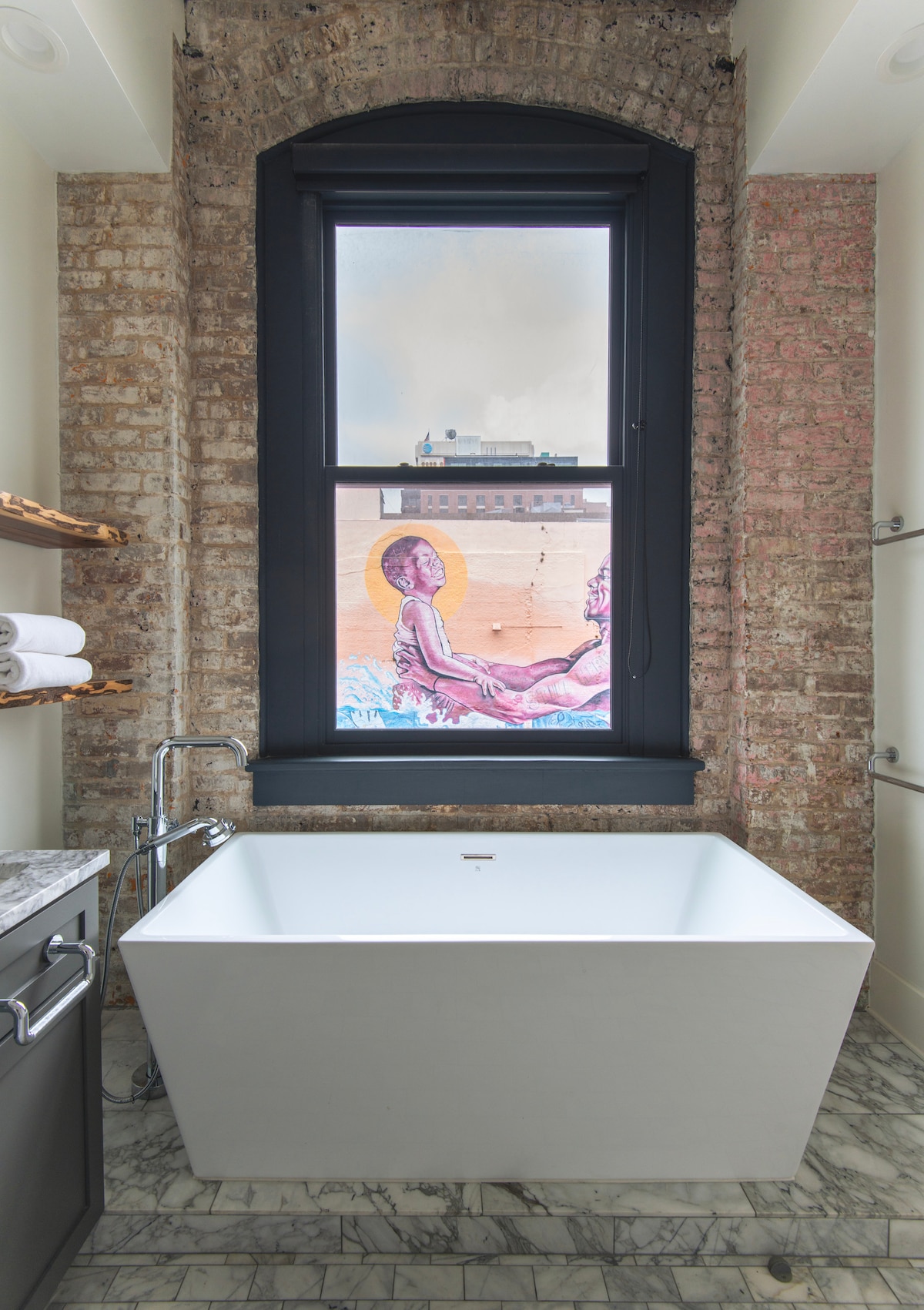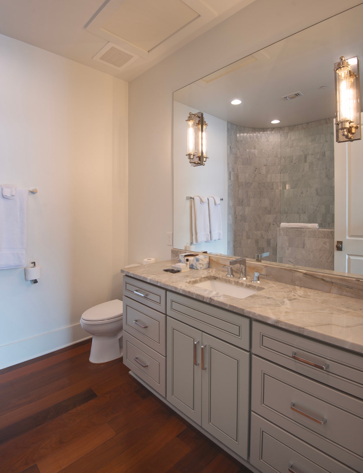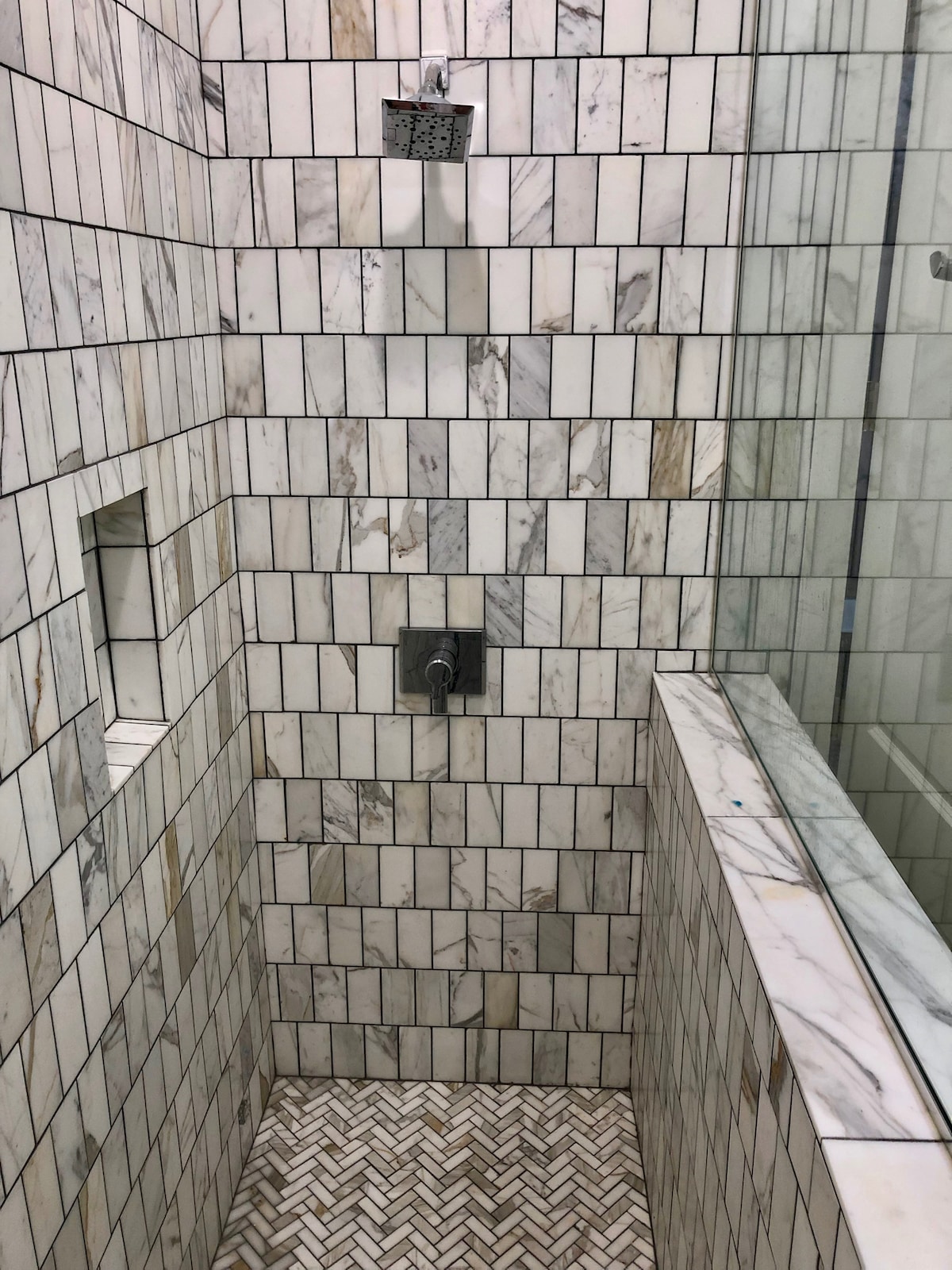 Bathrooms have hand selected marble countertops, marble tile walk in showers, and the master bathroom has both a walk in shower and a modern soaking tub.